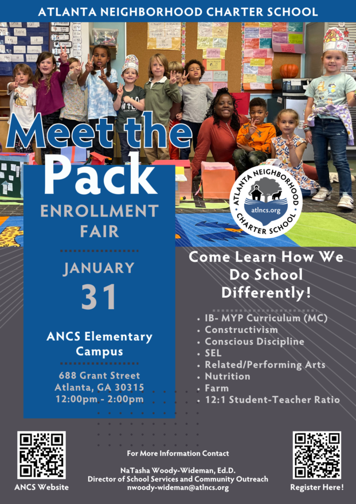 Join us for the 2026 ANCS Enrollment Fair to learn what makes Atlanta Neighborhood Charter School (ANCS) unique! Discover how we “do school differently” through our IB-MYP curriculum, constructivist teaching methods, Conscious Discipline approach, and emphasis on social-emotional learning (SEL). Explore our farm-to-school program, related and performing arts opportunities, and small class sizes with a 12:1 student-teacher ratio.