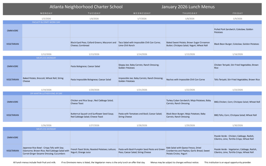 - The lunch menu is posted monthly on the ANCS Nutrition website. All meals are compliant with the guidelines established by the National School Lunch Program (NSLP).